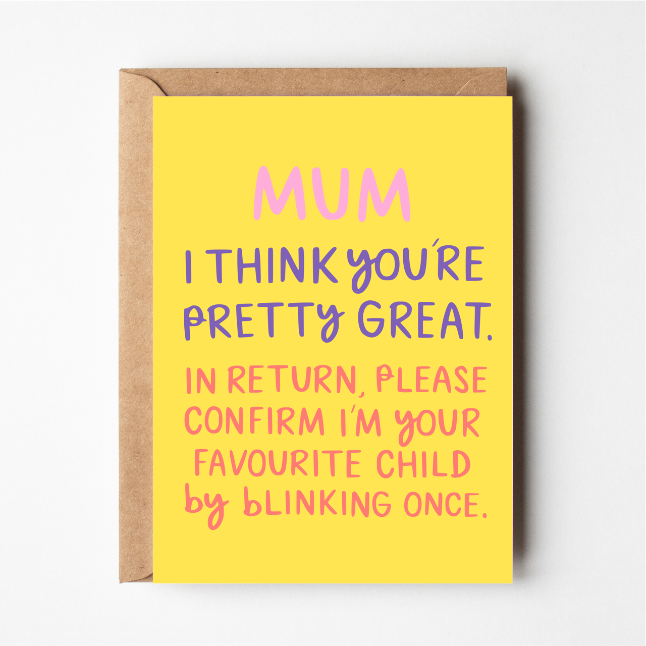 A funny and quirky card for your mum from her favourite child. Perfect as a Mothers' Day card, a birthday card, or even as a 'just because' card.